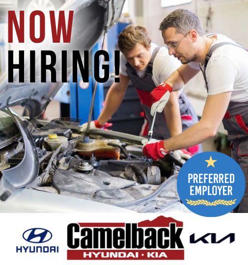 Camelback Hyundai KIA in Phoenix is hiring automotive service technicians and mechanics to perform vehicle diagnostics, repairs, and maintenance in a climate-controlled, state-of-the-art facility. The role offers competitive pay based on experience and certification, sign-on bonuses for master technicians, paid training, productivity bonuses, and benefits including medical insurance and 401(k). Candidates should have prior technician experience, a valid driver’s license, and a strong work ethic, with dealership experience preferred but not required.
